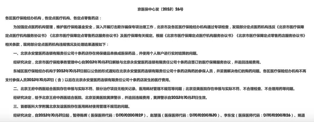 近日,北京市医保局通报了多家医院。由于违反医保政策,9名医师被暂停医保处方资格1个月至3个月(自2023年10月31日起开始),并追回违规费用。